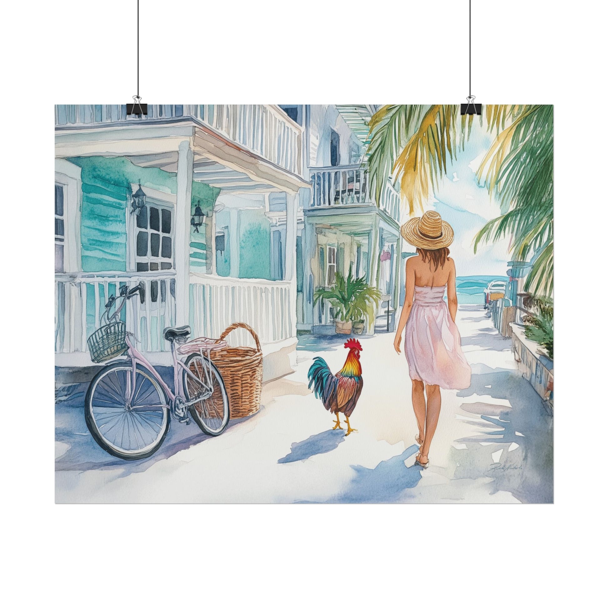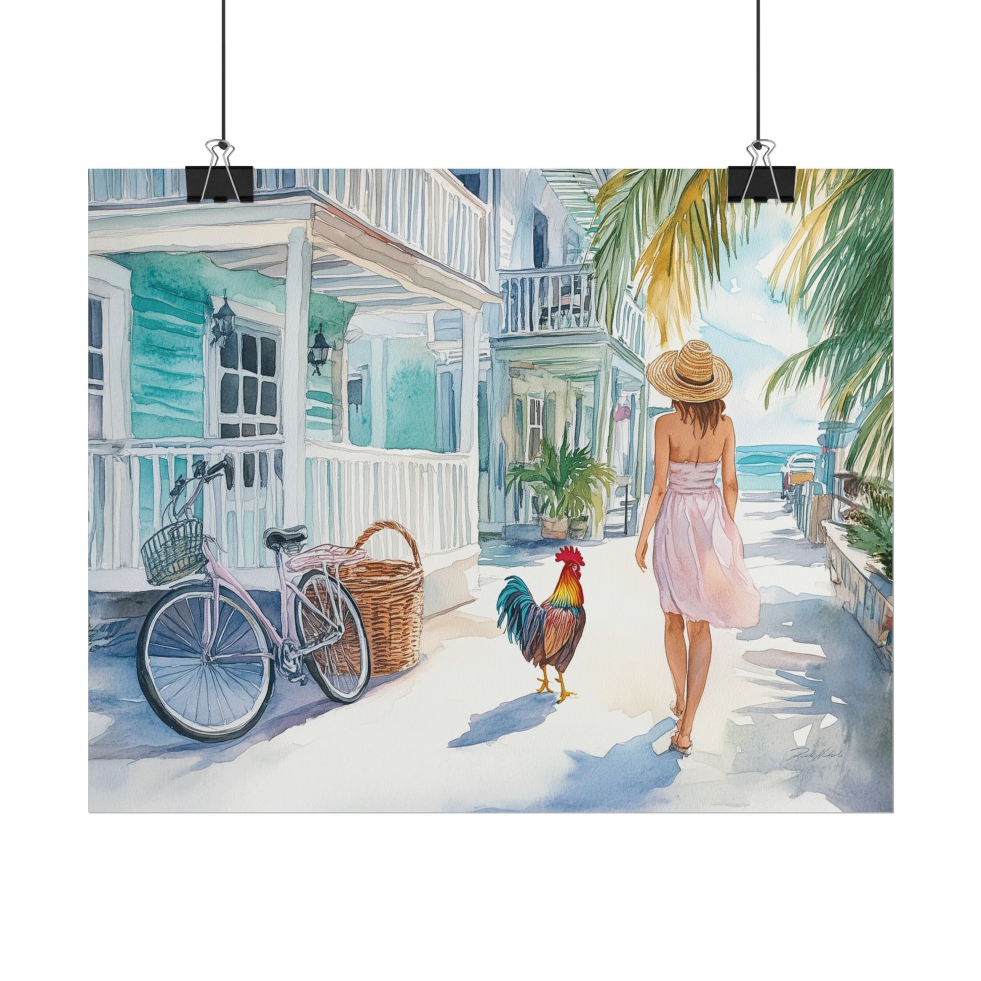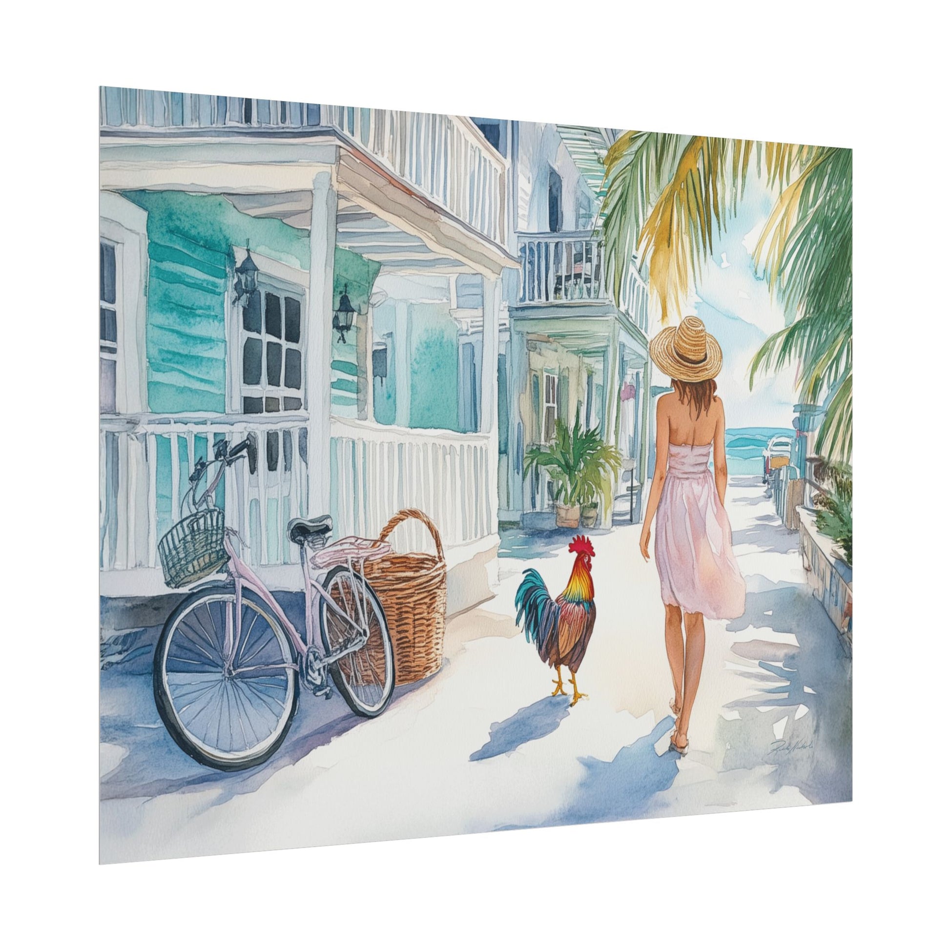 Bring home a slice of Caribbean charm with this dreamy Key West rooster watercolor art print. Bathed in soft coastal pastels, the scene features weathered conch houses, swaying palm trees, a vintage bicycle, and a colorful rooster strutting alongside a woman in a breezy sun dress and straw hat. A hint of turquoise ocean peeks into the background, while delicate mandala patterns float across the sky—offering a rich, boho-meets-vacation aesthetic.